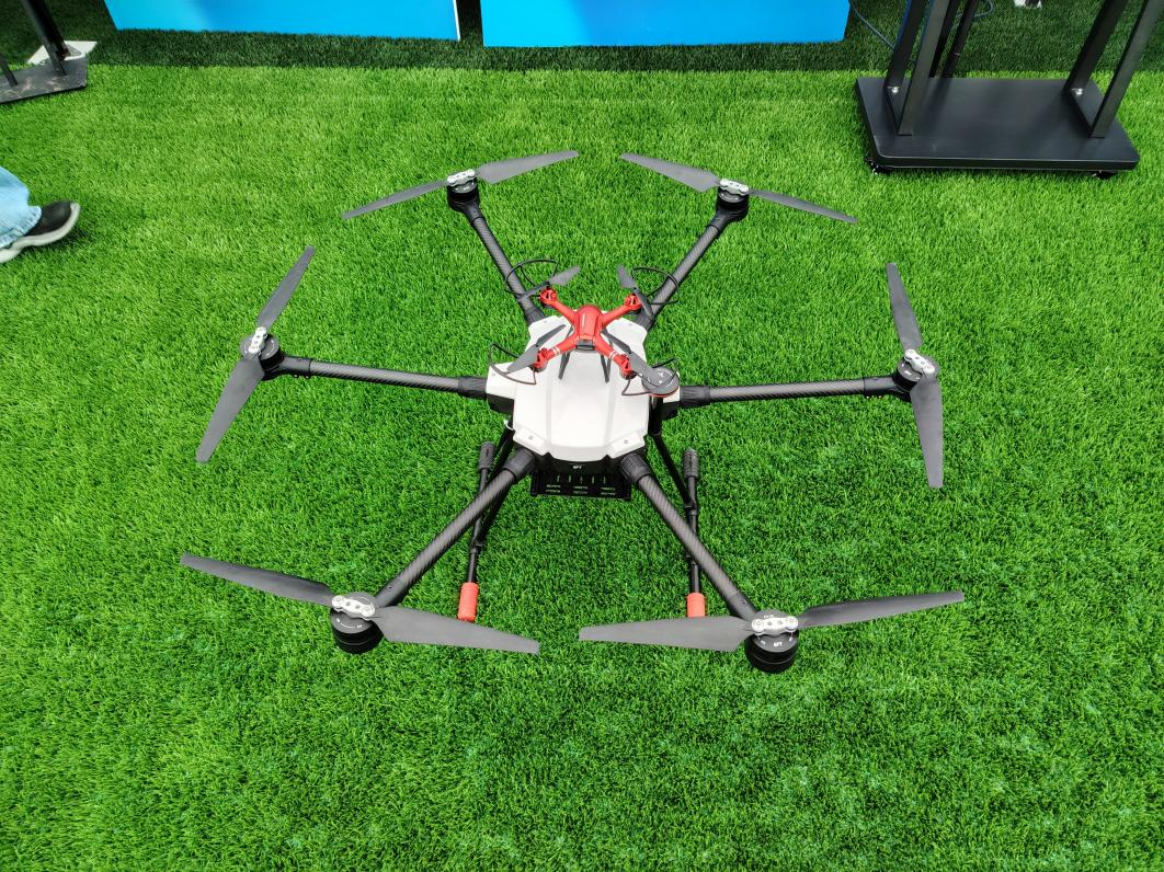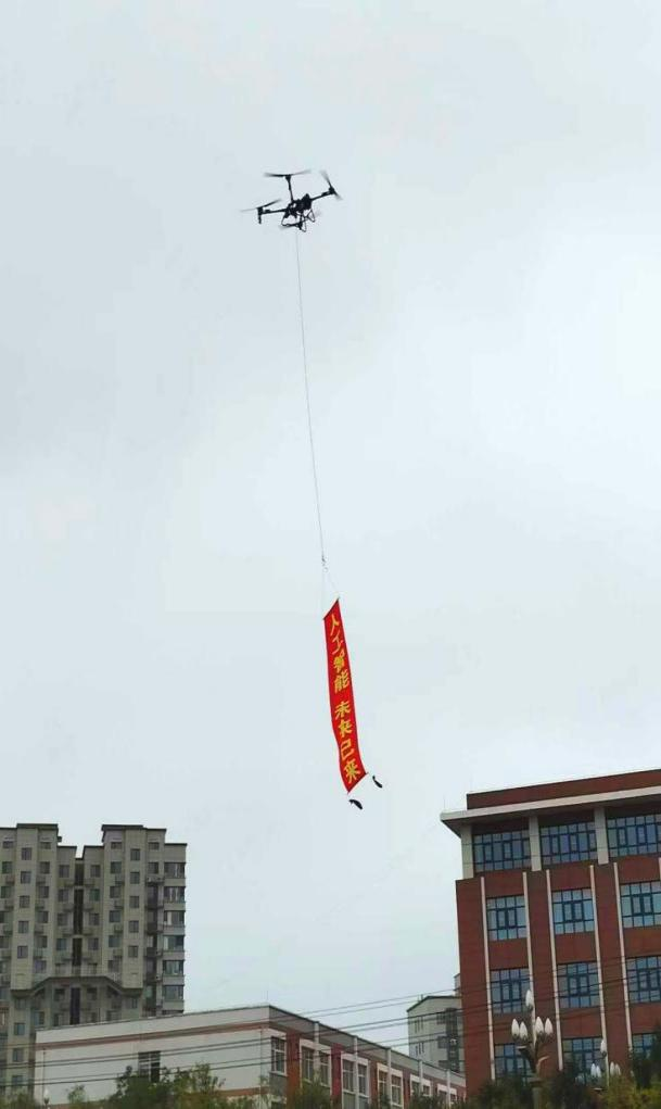 Great Heat 若说展位是“静态科普课堂”,那户外飞行展示区便是“动态展示舞台”。活动期间,宝鸡新正大科技的无人机进行飞行表演,吸引数百名观众围拢观看。 在常规飞行环节,航拍无人机率先升空,在空中完成“空中悬停”“360度旋转”等动作,机身搭载的航拍设备还将现场画面实时传输至地面屏幕;随后登场的吊条幅飞行表演更是将氛围推向高潮—大载荷无人机悬吊国旗,在会场播放国歌时从飞行区缓缓升空,沿着活动现场的环形路线飞行一周,条幅在阳光下格外醒目,吸引了不少观众举起手机拍照。随后印有“人工智能,未来已来”字样以及带有公司宣传内容的红色条幅,前后从飞行区缓缓升空,沿着活动现场的环形路线再次飞行一周,定格这一充满科技感的画面。最后的水果吊运展示则聚焦无人机的实用价值:1架大载荷无人机挂载着装有苹果的箱子,按照预设路线飞行至指定区域后,平稳吊运起降,直观展示了无人机在“物资运输”“农业作业”中的应用能力。